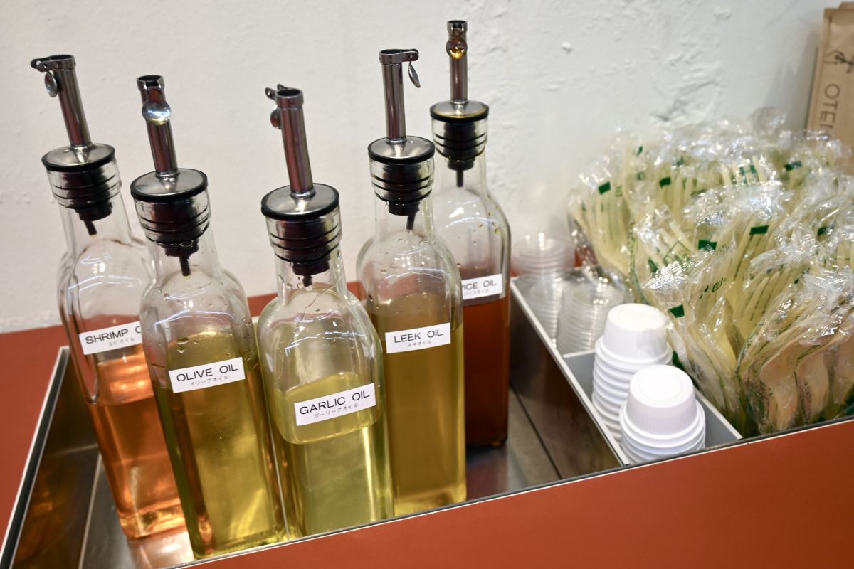 オイルのフレーバーは、エビオイル、オリーブオイル、ガーリックオイル、ネギオイル、スパイスオイルの5種類が用意されています。好みに合わせてかけると、さらなるカスタマイズが可能に。2種類を組み合わせて使うのもおすすめだそうです。