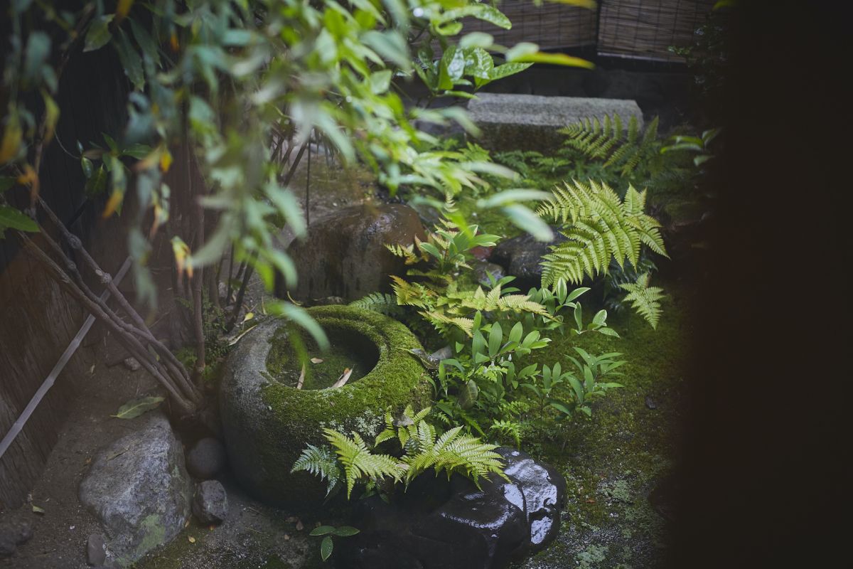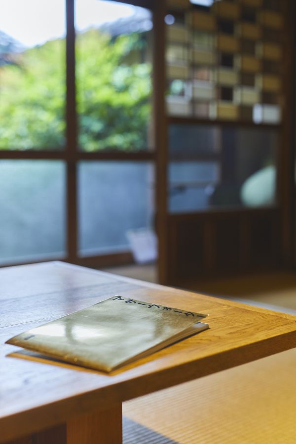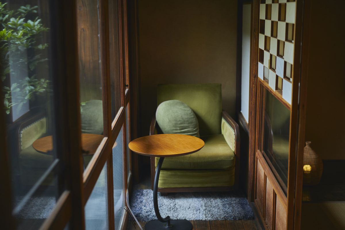 市松格子のガラス越し、奥庭の前にも密かに1席用意されており、一人の時間を楽しめそう。