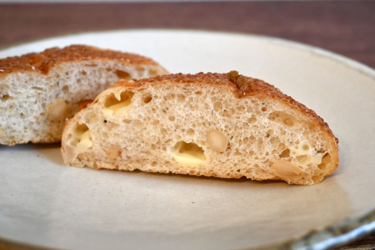 「丸パン」は乳製品や卵を使っていないヴィーガン仕様。もっちり、ふわふわとした生地は、噛むと口の中にやさしい甘さが広がります。色の濃い点が焙煎したおから。プチプチとした食感を楽しむことができます。