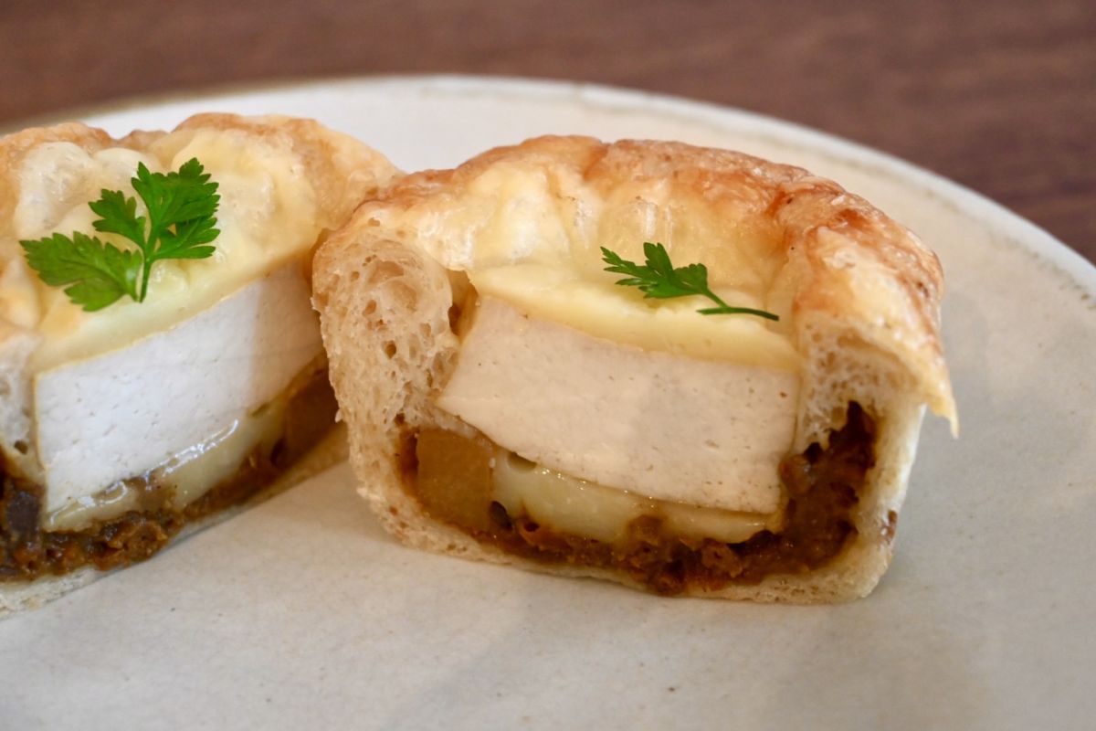 大きな四角い豆腐が入った「豆腐カレーパン」。カレーには醤油豆が入っています。チーズもトッピングされています。豆腐はカレーで煮込んであり、最初から最後までカレーの味を楽しめるのもうれしいポイントです。
