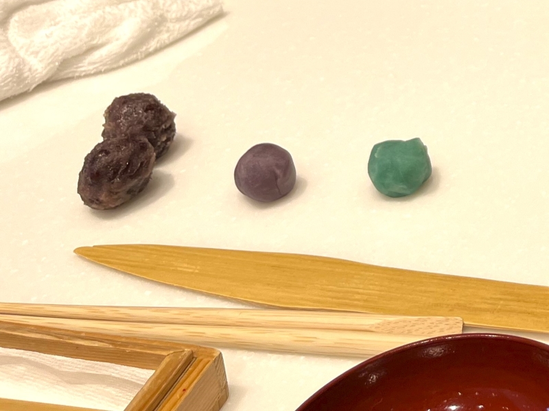 お菓子の中核となる小倉餡と、青、紫、白に色付けした餡を用意したら和菓子作りがスタート!