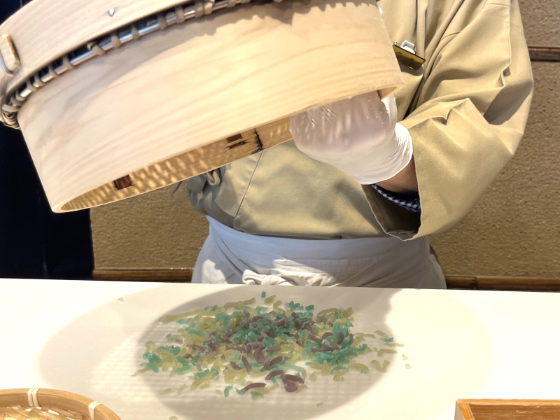 このようにこされた食材を「きんとん」とよぶため、今回注文したお菓子も「あじさいきんとん」という名前になっています。「きんとん」という言葉はよく耳にしますが、定義を聞かれるとなかなか答えられないもの。職人さんに作業工程や由来などをじっくり聞きながら、和菓子の世界に浸れるのもおひとりさまならではの楽しみ方ですね!