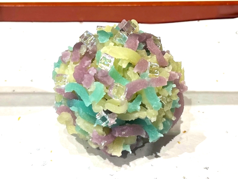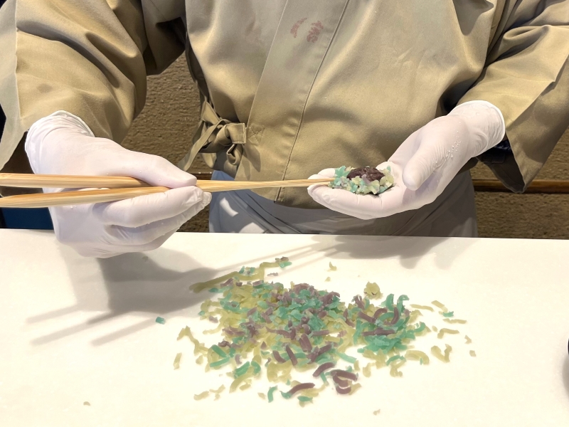 3色の餡をこし終えたら、細い箸を使って、色や大きさのバランスに気をつけながら小倉餡に付けていきます。色が偏ったり、餡がつぶれたり、全体の量が偏ったりすると美しくなくなってしまうので、職人さんの腕の見せどころです。