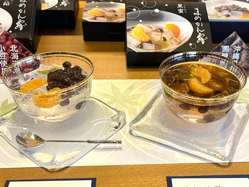 「鶴屋吉信 TOKYO MISE」では、和菓子を購入することも可能です。夏季に人気なのは、冷やしていただく「まめかん露」!北海道産の小豆をふっくらと炊いた「小倉餡」712円と、沖縄県産の風味豊かな黒糖を使った「黒蜜」648円からお好みの味を選ぶことができます。