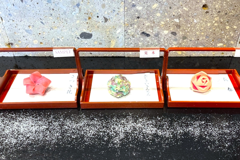 「菓遊茶屋」では、お菓子を3種類から、ひとつ選ぶことができます。取材時は写真左から、「さつき花」、「あじさいきんとん」、「長春(ちょうしゅん)」のラインアップでした。この3種類は、時期やタイミングによって変更されます。訪れる時期によって新しいお菓子に出合えるのが魅力的です。