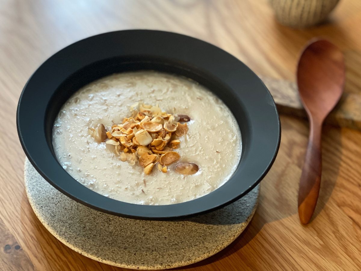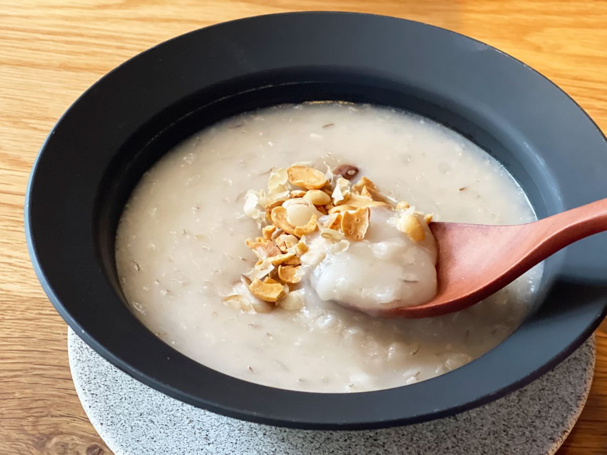 さらに、粥の上にはカリカリに炒った「大豆」と、ふっくら炊き上げた「とら豆」がトッピングされ、食感のコントラストも楽しめます。