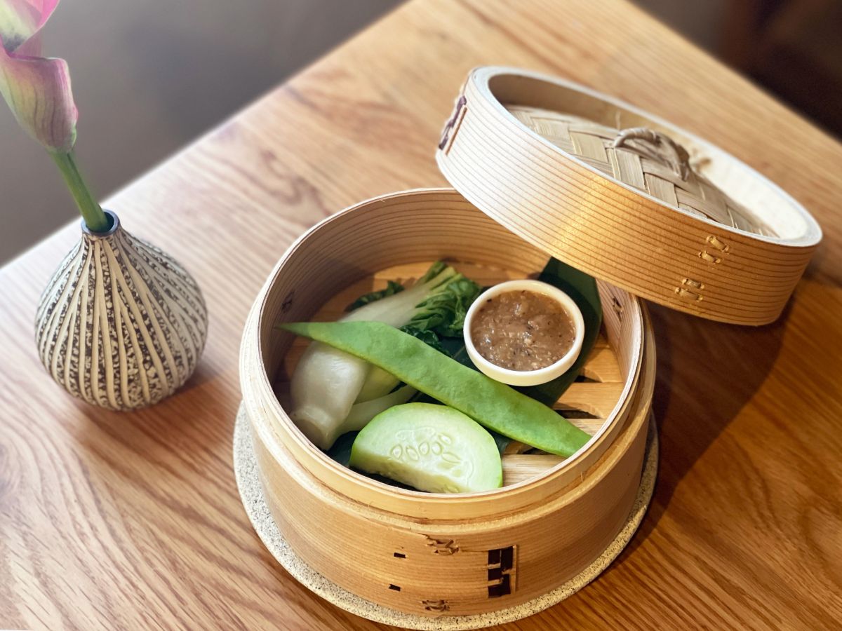 「季節野菜のせいろ蒸し」は旬の野菜を揃えているそうで、みずみずしさがたまりません。そのままで野菜の甘みをダイレクトに味わうも良し、うま味の詰まった「大豆と干しシイタケのソース」を付けても良し、な一品です。