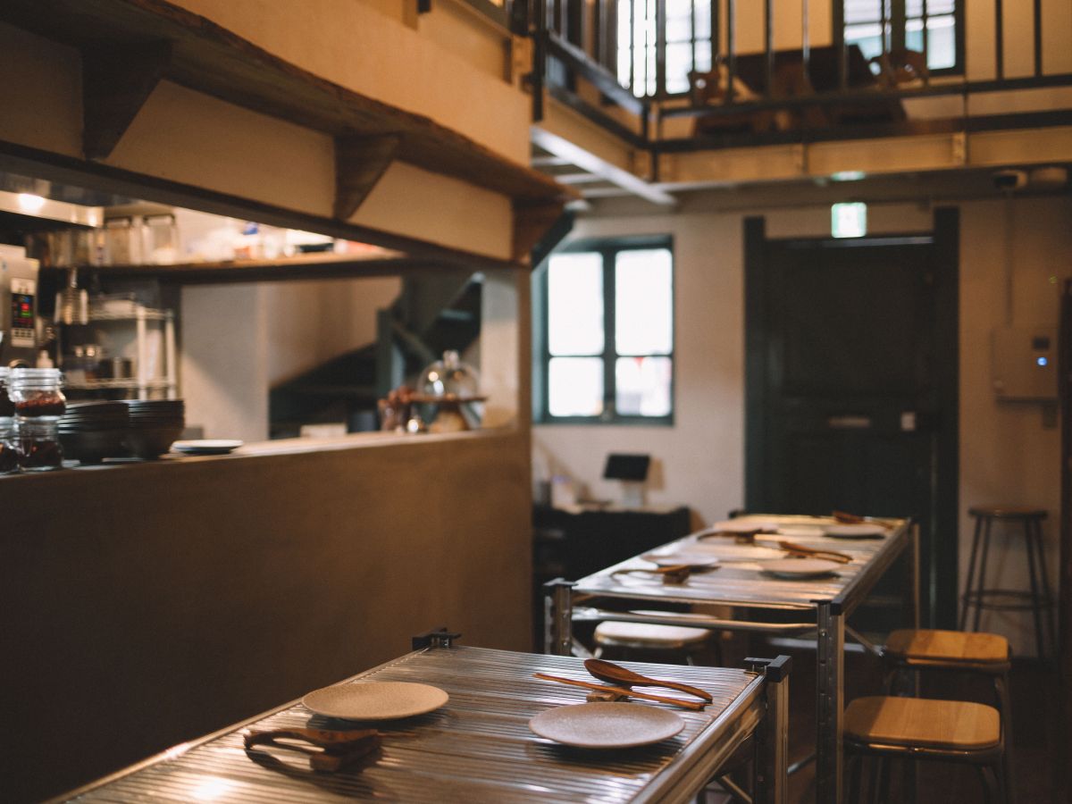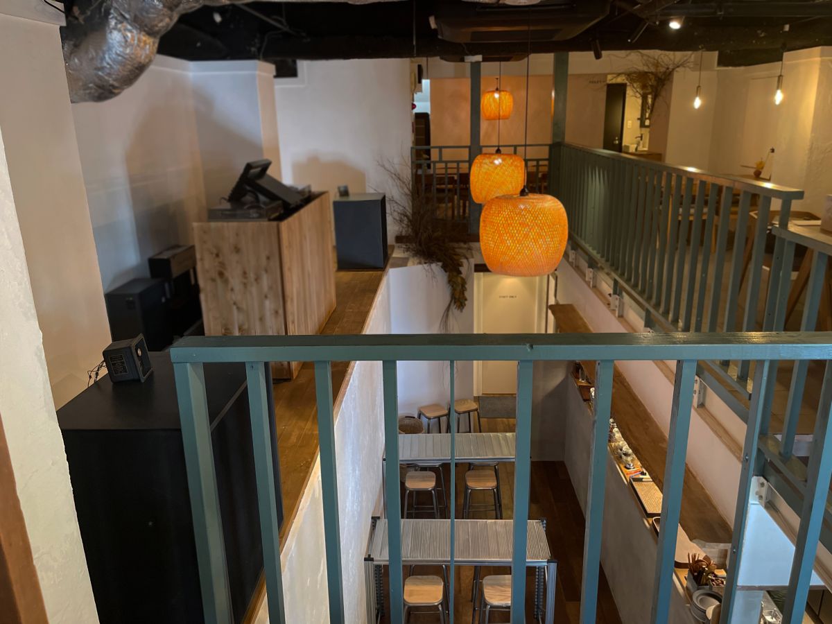 店内は2階建ての開放的な空間。1階には脚の長いテーブルやチェアが並び、すぐ横にはキッチンカウンターが。2階には落ち着いたテーブル席が用意されています。