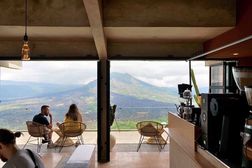目の前に広がるバトゥール山の雄大な景色を見渡せるカフェ。キンタマーニ高原で絶景カフェが流行り出す前の、2019年からオープンした人気のカフェです。1階は落ち着いた雰囲気、2階はテラス席や階段シートなど席タイプは様々。