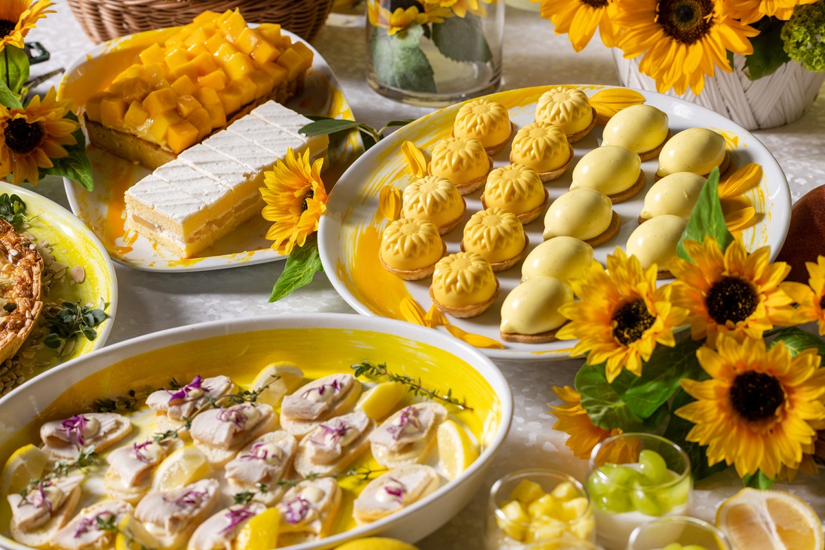 「グランド ハイアット 東京」2階の「フレンチ キッチン」で開催される「サマー サンフラワー アフタヌーンティー」は、見ている私たちにも元気を分けてくれるような、真夏の日差しを浴びながら咲き誇るひまわり畑でのピクニックがテーマ。旬のフルーツを使ったスイーツや、フレンチの本格セイボリーがブッフェスタイルで提供されます。