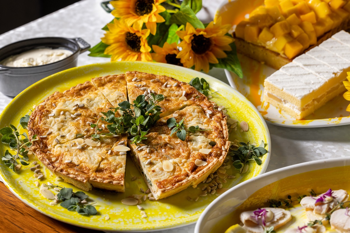 スイーツは、ビタミンCが豊富に含まれ、疲労回復にも効果が期待できるレモンや、夏に旬を迎えるマンゴーやパイナップル、ピーチなどのフルーツをふんだんに使用した全8品が揃います。自家製のサブレの上に口当たりのなめらかなムースをのせたレモンムースや、ひまわりのはちみつを使ったムースを花型に成形したひまわりのタルトレットなど、夏らしい見た目のスイーツは思わず写真に残したくなる可愛らしさです。