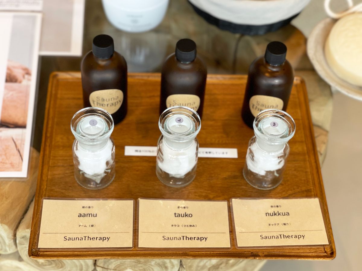 「SaunaTherapy」では、アロマセラピストとともにロウリュに使用するアロマを開発しているのだそう。香りは3種類で、季節ごとに変えるというこだわりも。取材時は朝をイメージした「aamu(あーむ)」、昼の「tauko(たうこ)」、夜の「nukkua(ぬっくあ)」があり、どれももすっきりとしていて癒やされる香りでした。
