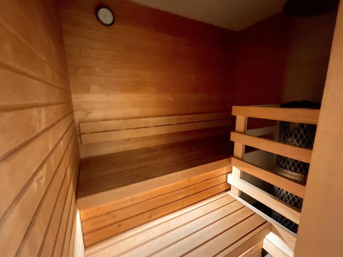 サウナ室は、間接照明とヨーロッパの木材「Alder(=ハンノキ)」を使用した心地いい空間。個室ですが、本格的なサウナストーブがどっしりと構えています。