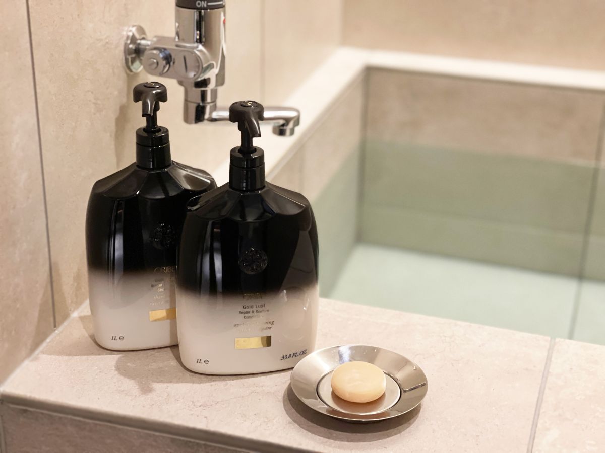 アメニティには、ラグジュアリーなヘアケアブランド「ORIBE(おりべ)」のシャンプー、コンディショナーが用意されています。ボディ&フェイス用には「SENTEURS D’ORIENT(さんちゅーる・どりあん)」の石鹸が。こちらは石鹸作りの歴史が深い国、レバノンで作られているヴィーガンソープです。高品質かつ香りにもこだわっているものばかりで、気分も上がります。