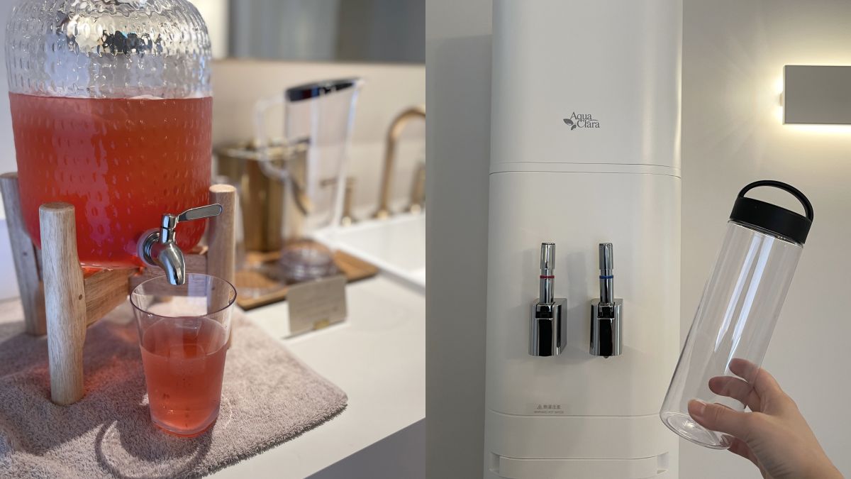 また、パウダールームにはドリンクサーバーもあり、冷温水や季節ごとにフレーバーが変わるハーブティーが飲み放題。この日のハーブティーはハイビスカス、アップル、ローズヒップ、ストロベリー、オレンジピールがブレンドされていてさっぱり。水分だけでなくビタミンも補給できて、たくさん汗をかいたサウナの後にぴったりです。