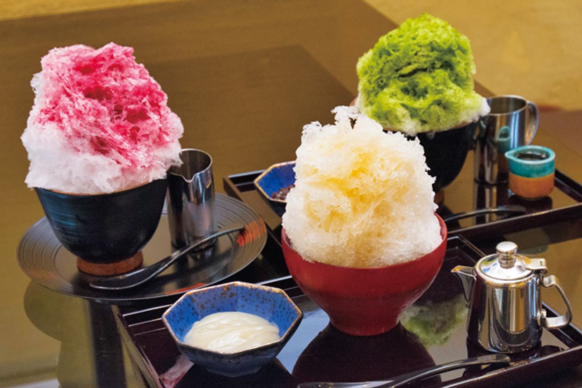 明治27年(1894)創業の「松月氷室(しょうげつひむろ)」では、自社製造の天然氷を使ったかき氷が一年中食べられます。薄く削られた氷はフワフワでやさしい口当たり。厳選した果物や素材を使ったシロップは、ほどよく甘酸っぱいのが特徴です。