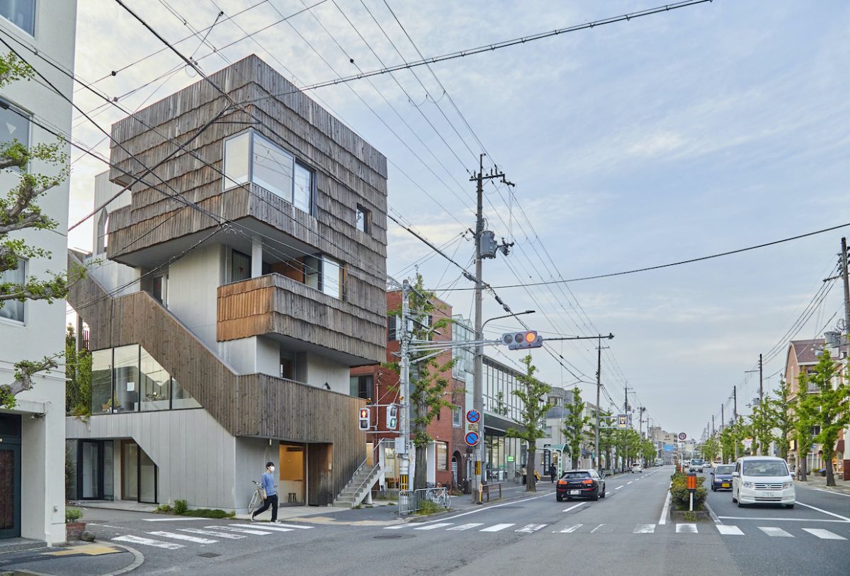 京都市左京区浄土寺、白川通沿いでバス停の目の前にある「菜食光兎舎」。ただし、看板が控えめで、何度か前を通っても気づかないくらいです。少し遠目に見た方がわかりやすく、外壁に木の板を貼った特徴的な4階建ての建物の2階がカフェ「菜食光兎舎」のある場所です。