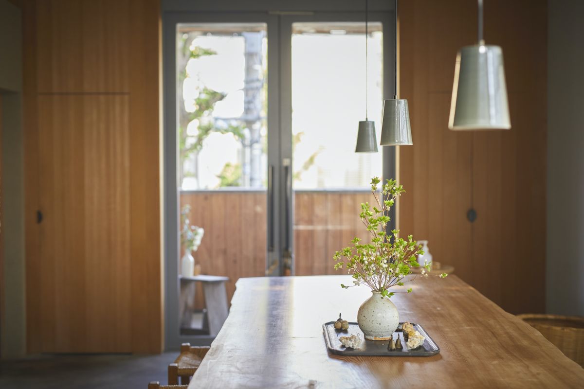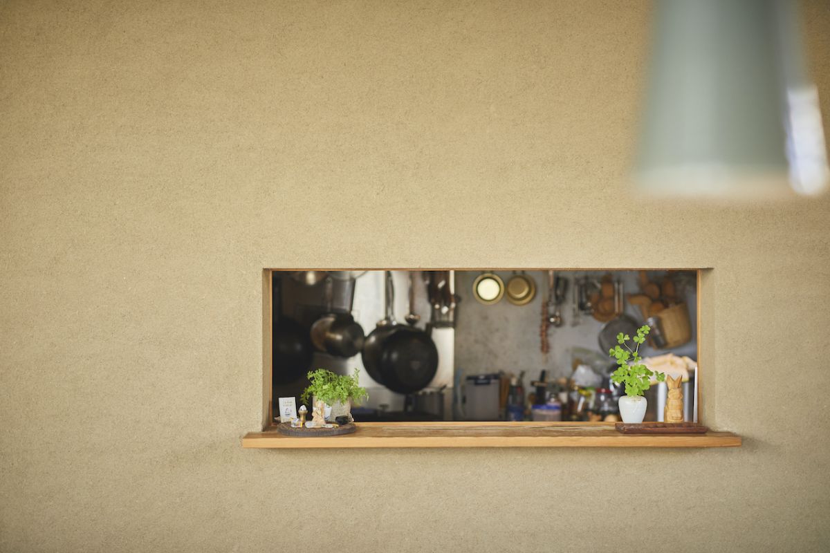 東の隅に土壁で囲われた部分が厨房。実家から運んできたという大きな古い木の水屋がぴったりと収まるサイズに設計して、数奇屋大工さんにしつらえてもらったそう。