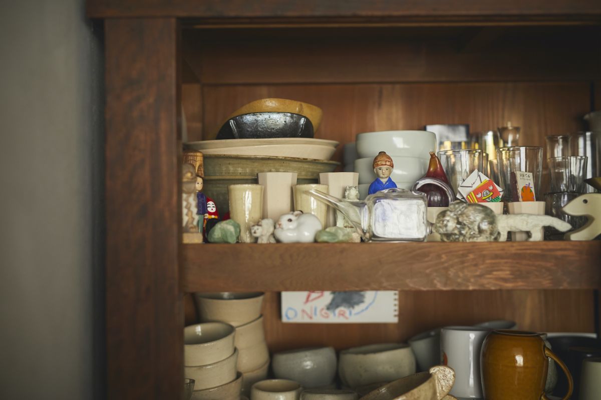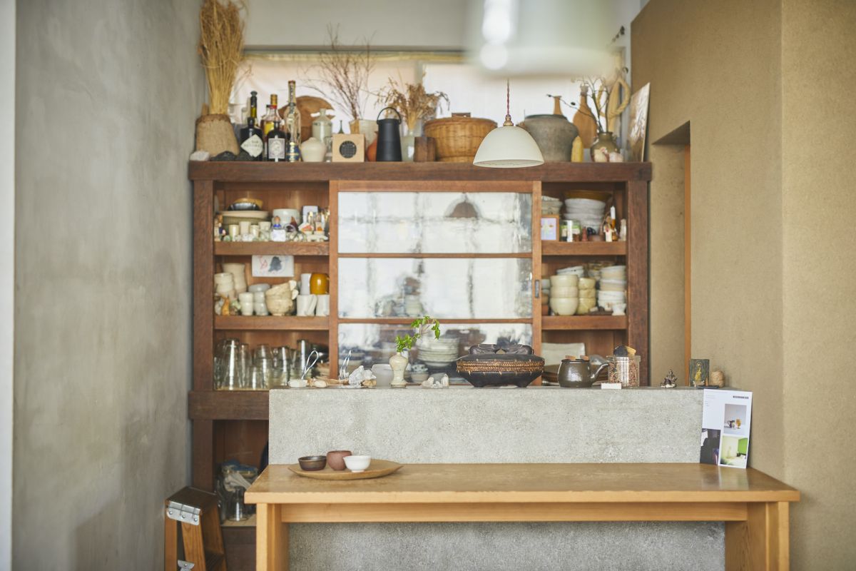 こちらが、加藤さんが実家から運んできたという水屋。手触りのよさそうな器の隙間を縫うように味わいのある雑貨たちが顔を出します。見回すと店のここかしこに素朴な草花や石などが飾られており、店主の人柄があらわれているようで、気持ちが和みます。