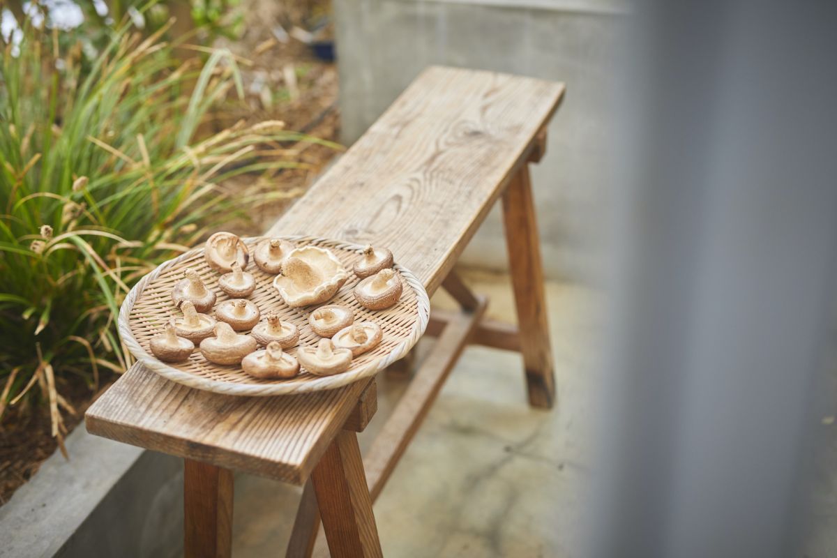 テーブルが届くのを待っているテラス席で、しいたけが日向ぼっこ。天日干しで、うまみをぐっと増やします。
