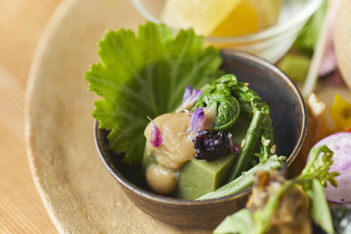 こちらの一皿はよもぎの若葉から加藤さんが手作りした豆腐。なめらかな食感によもぎの香りがほんのり。山菜のこごみが添えてあります。「旬の野菜や山菜、野草が持つ苦味やえぐみなどの雑味も大切にしたい」と一品ずつ、愛情を込めて丁寧に作られています。