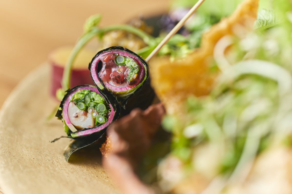 「ヴィーガンやオーガニックにストイックになりすぎず、おいしい野菜を食べる喜びを感じてほしい」と工夫を凝らします。例えば、野菜梅肉のり巻きは、のりの香ばしさと梅肉の酸っぱさがよいアクセントに。生野菜のシャキシャキとした心地よい食感、春の匂いがする山菜、とろりとしたスープなど野菜の個性をいかした料理に五感が刺激されます。