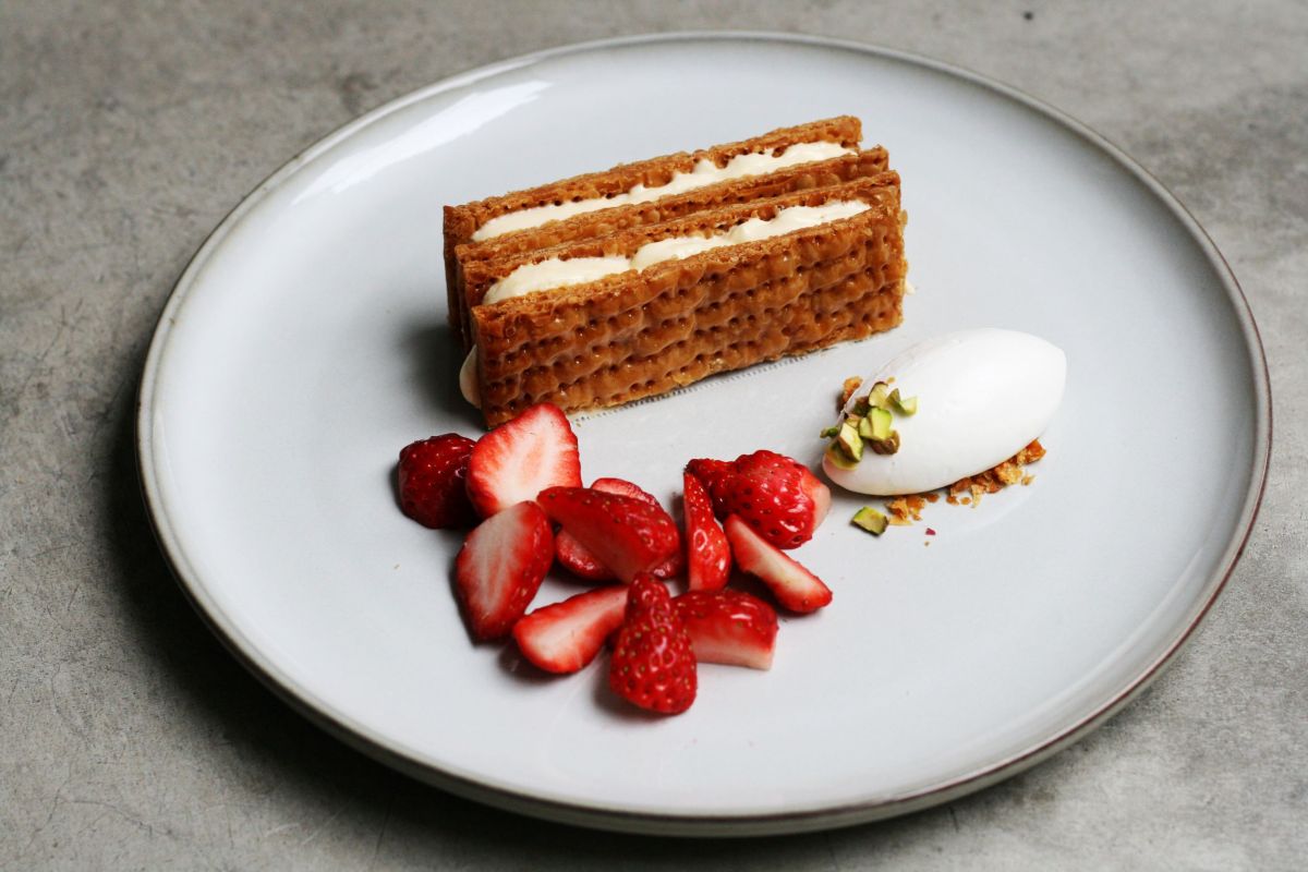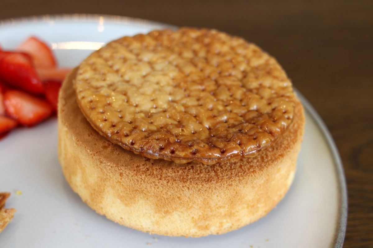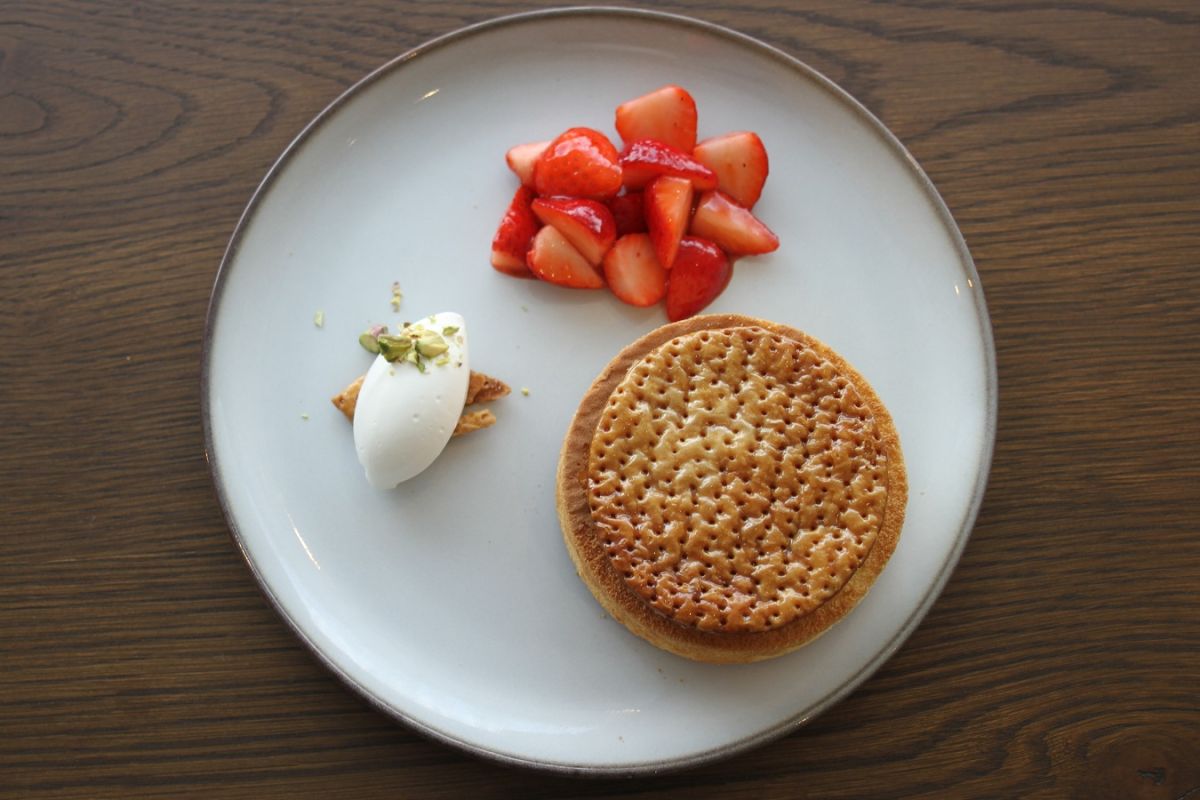 イートイン限定の人気メニューの「焼きたてガレットパンケーキ」1800円は、パイ生地とカスタードクリーム、パンケーキをサンドしたスイーツで、ザクッという食感が新感覚!と、SNSでも話題をよんでいます。ひと口食べてみると、確かにザクザクッという香ばしい音。いままでのパンケーキにはないというのがよく分かります。