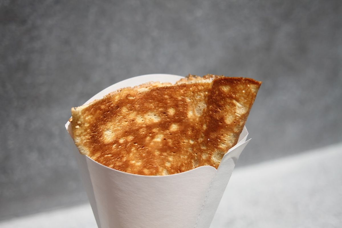 こちらの「発酵バターシュガー」(テイクアウト680円、イートイン1380円)は、生地そのものの味を楽しめるようにと、トッピングが一切ないクレープ。バターの香りが濃厚で食べ応えのある生地に、ほんのりとまぶしてある砂糖の甘さの組み合わせは、確かに「シンプルだけどおいしい」を体現しています。