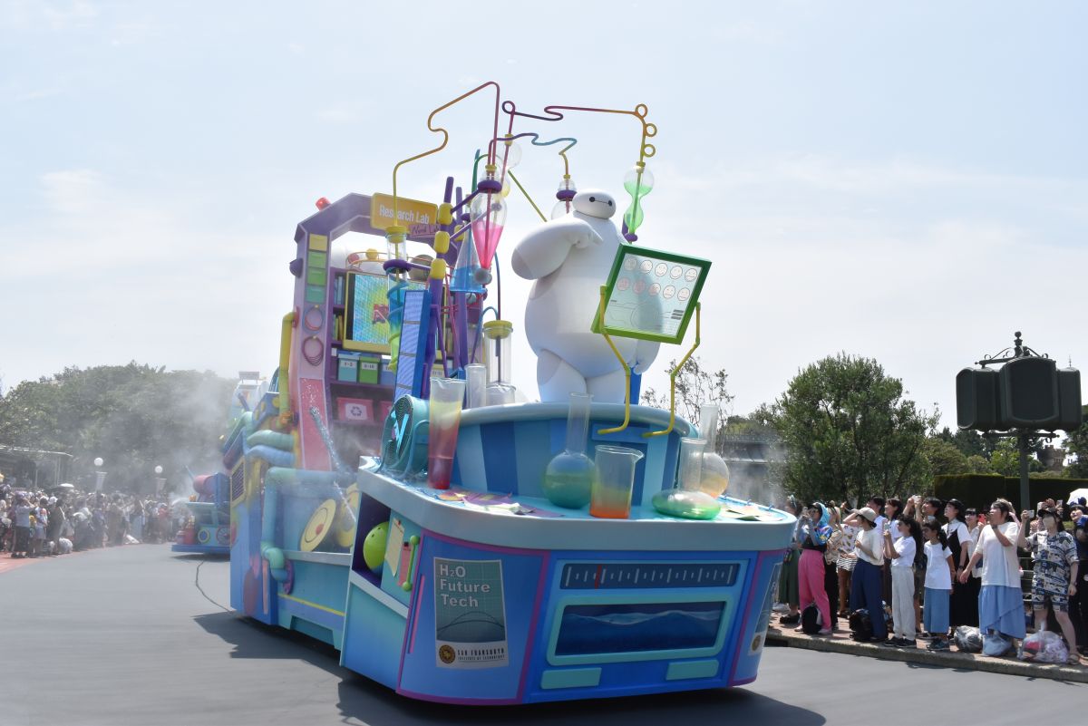 暑さによって低下したゲストの“エナジーレベル”を上昇させるミッションを任せられたベイマックスが、涼しいミストを撒きながらケアが必要なエリアをチェック。ゲストの“エナジーレベル”が著しく低下しているエリアを検知するとフロートを停止して散水スタート!!