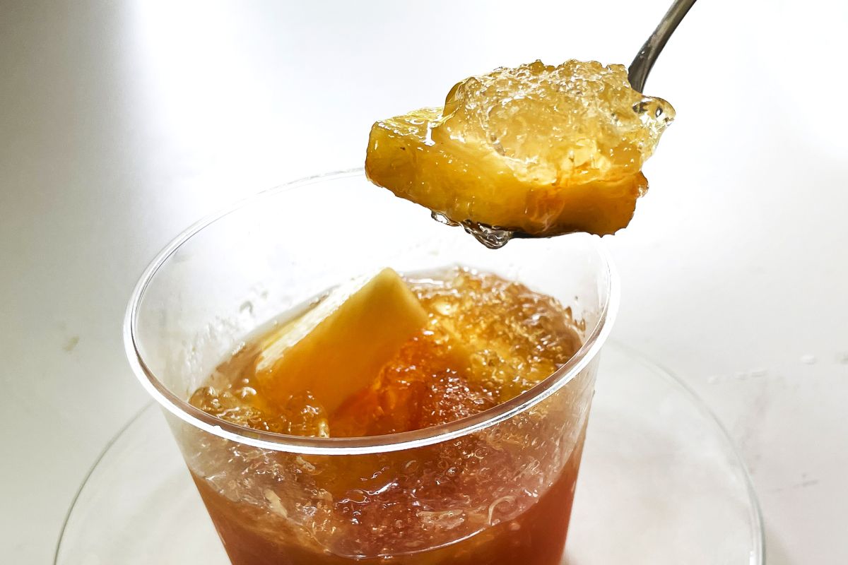 全体が茶色っぽく、一見地味なビジュアルですが、ふたを開けると、キラキラと輝く紅茶色のジュレの下に、大ぶりにカットされたパイナップルが沈んでいるのが見えます。さっそくスプーンでジュレとパイナップルをすくって味わいました。