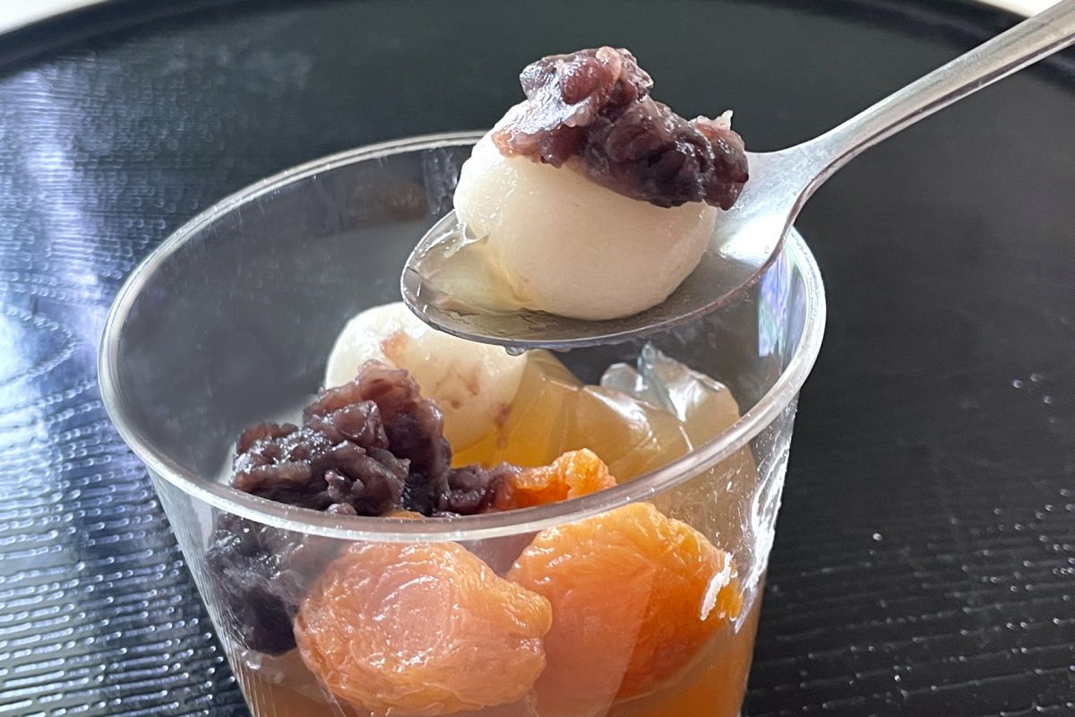 ふたを開けて、具材の入ったカップを取り出してみました。丸い白玉風の羽二重餅が3個と、アンズのシロップ漬けが4個、あんこも入っていて、老舗専門店のあんみつのよう。もう、期待しかありません。食べる前からワクワク。