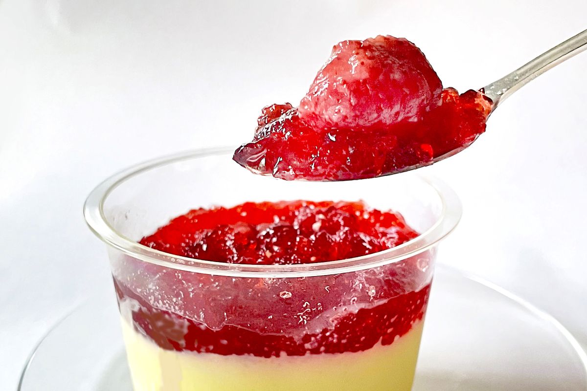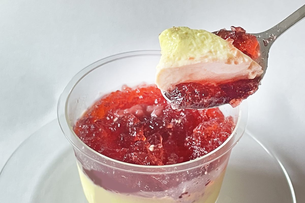 ふたをあけるとイチゴの甘い香りがふわっと漂います。カップの上の方の2cmほどが真紅のイチゴのジュレ。ここだけ味わってみると、甘酸っぱくて、ぶるんとした食感です。