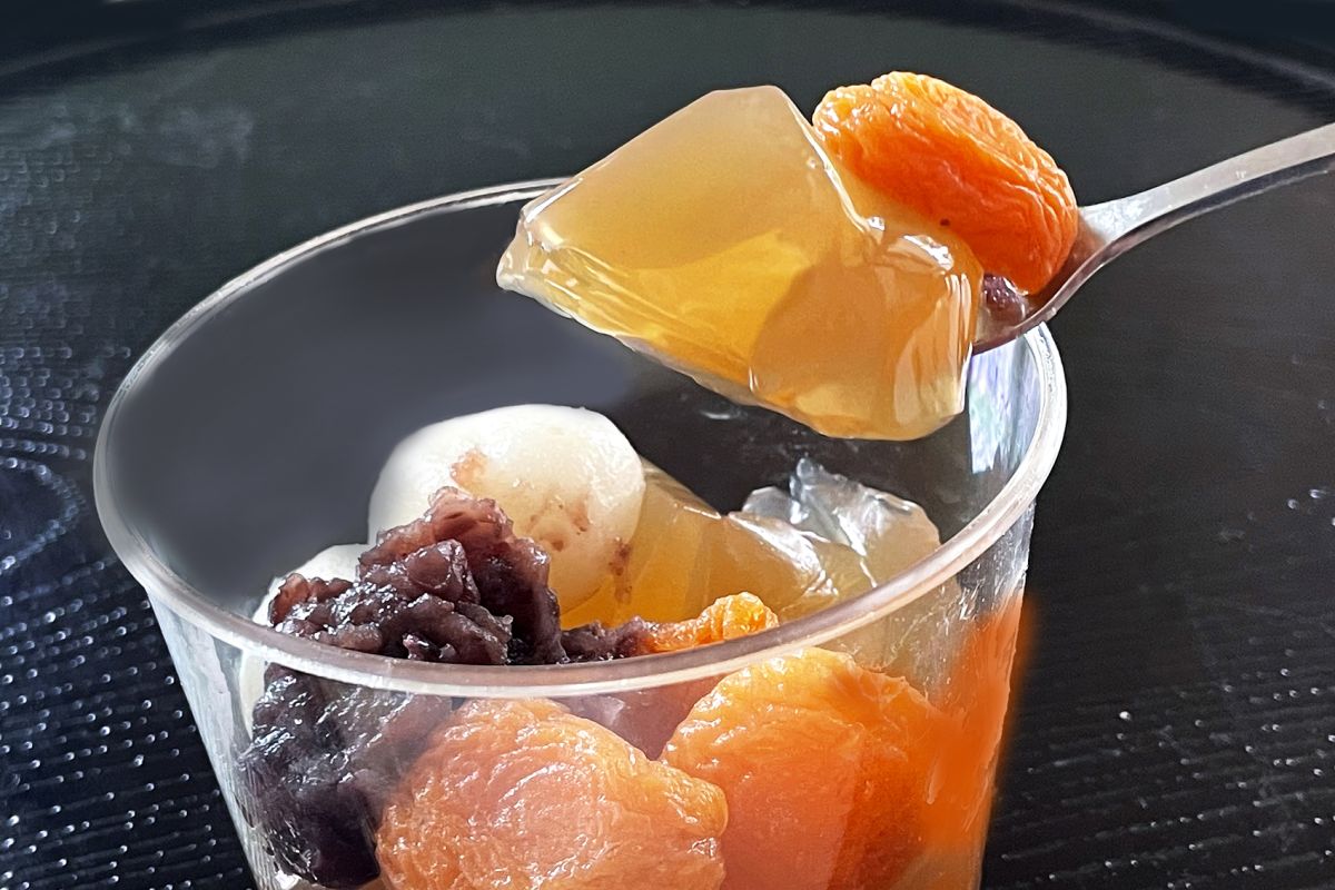 プラスチックケースで別添えになっていた具材を、梅ゼリーの上にトッピングして準備万端!いよいよ実食です。