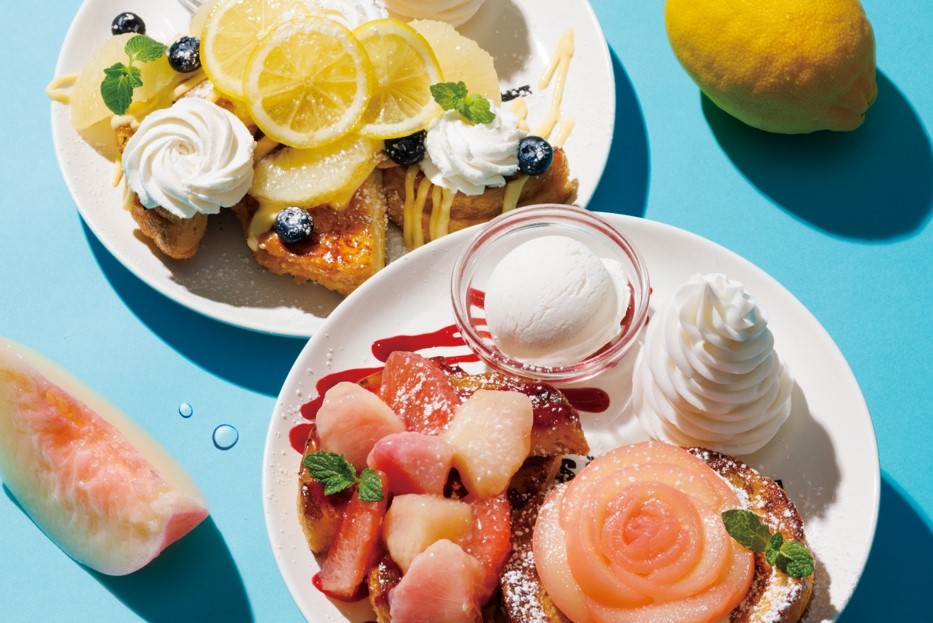 新商品の「フローズンハニーシトラス」も要チェック!クリームチーズをサンドしたあつあつのフレンチトーストに、ひんやりフローズンヨーグルトクリーム、レモンクリーム、グレープフルーツがすっきりとマッチした一品です。トッピングのレモンのはちみつ漬けもフローズンで、じめじめ&暑いこの季節にスカッとさわやかな気分にさせてくれますよ。