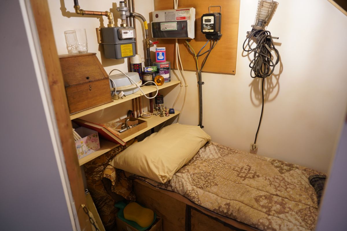 1畳ほどの小さすぎる部屋に寝床が設えられており、電気メーターなどの機材もリアルに再現。こんなに狭い空間に、緻密に計算されたセットが作られていたのかと考えると感動せざるを得ません。