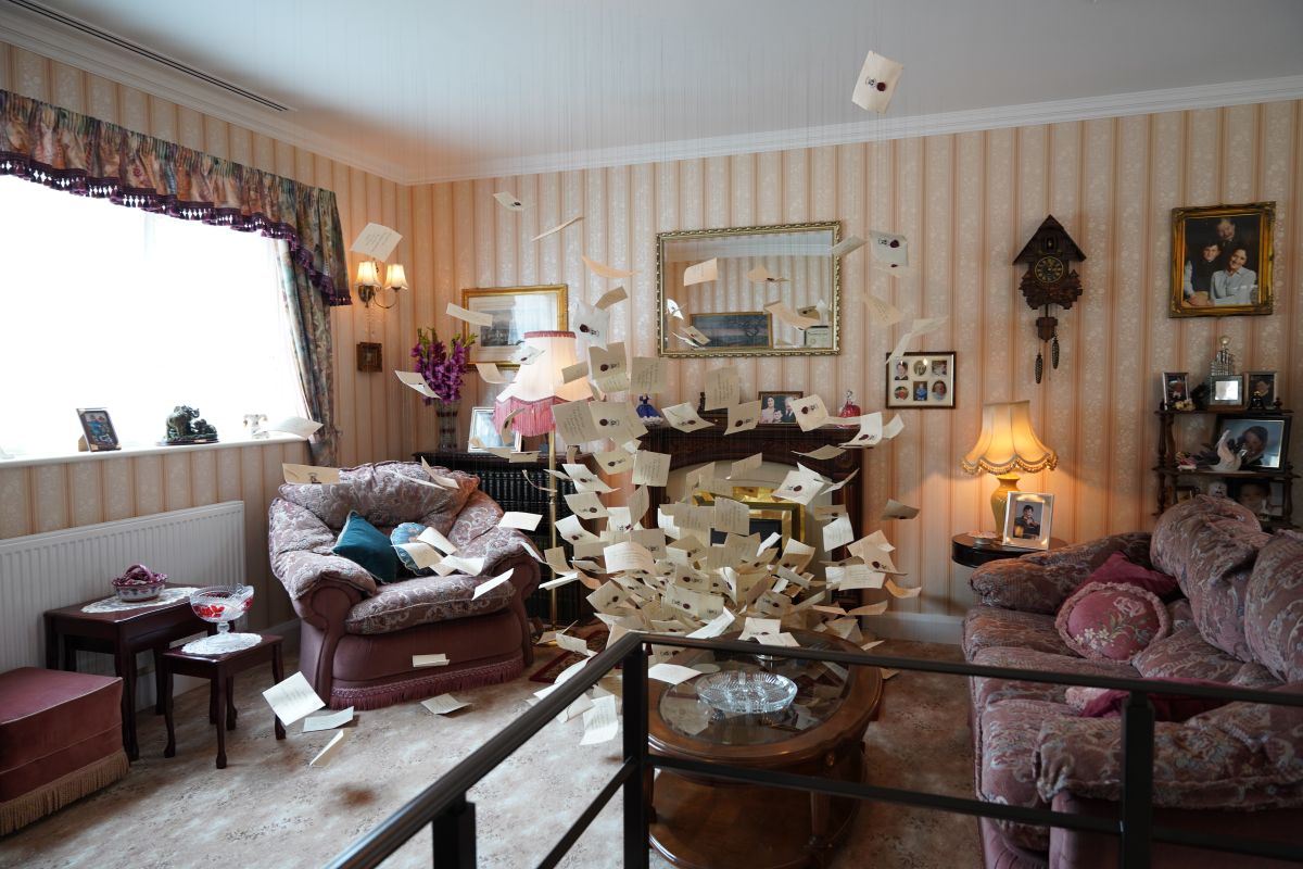 リビングへ進むと、ホグワーツ魔法魔術学校からハリー宛に入学許可証の手紙が無数に届いたときのシーンが再現されています。無数の手紙のセットに目を奪われがちですが、よく見渡してみると壁に飾られたダドリーの幼少期の写真など写真や、使い込まれたソファなどどれも映画のままで、まわりを見渡していると自分も映画の一部になったような気分に。