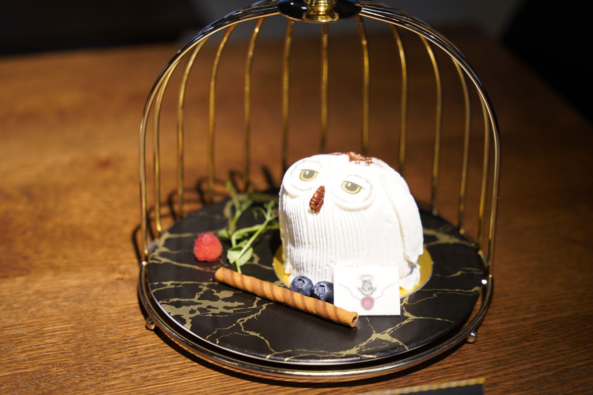 魔法ワールドの世界観に浸れる広々とした店内では、映画『ハリー・ポッター』にちなんだ趣向を凝らしたメニューを用意。写真はハリーのペットであるフクロウがケーキになった「ヘドウィッグケーキ」1500円。
