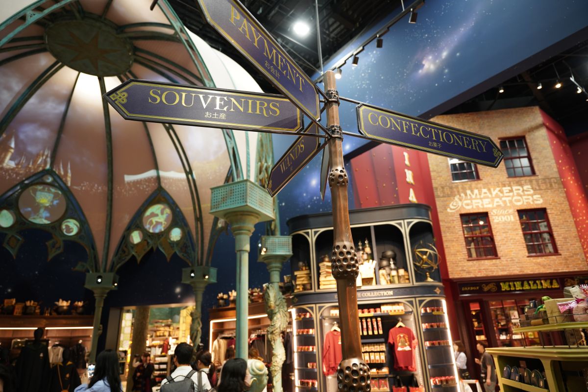 「ハニーデュークス」、 「オリバンダーの店」、「フローリッシュ&ブロッツ書店」など、「ダイアゴン横丁」のショップの要素を取り入れたショップの数々は眺めているだけで魔法使いとして買物をしているような気分になれそう。映画ファンにはたまらない細かい装飾はセットのみならずショップのインテリアにも反映されています。例えば写真の案内板の柱をよくみると、映画内で「死の秘宝」のひとつとされる「ニワトコの杖」のデザインに。買物の時間までしっかり魔法世界の気分で楽しめますよ。