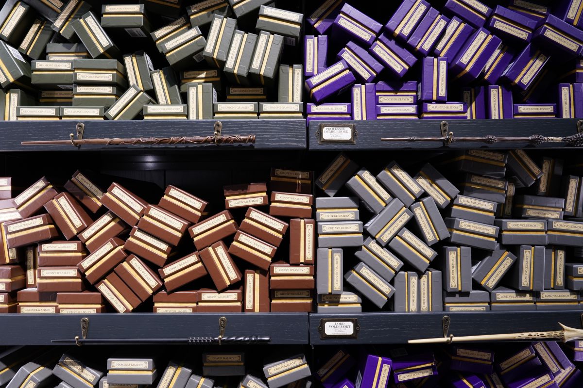 こちらは「オリバンダーの店」をイメージした魔法の杖を販売するショップ。映画内同様、あえて無造作に並べられた杖が入ったボックスに思わずテンションが上がります。杖はそれぞれキャラクターのモデルごとに分けられていて、デザイン、長さ、色がそれぞれ異なるので、お気に入りを見つけてみましょう。