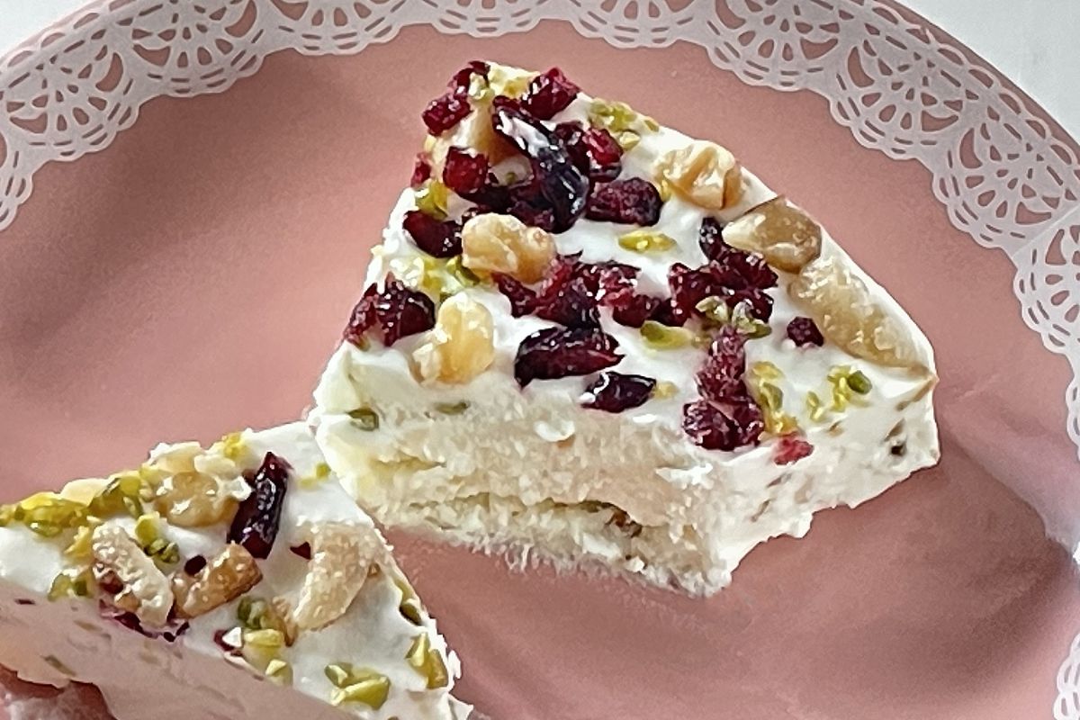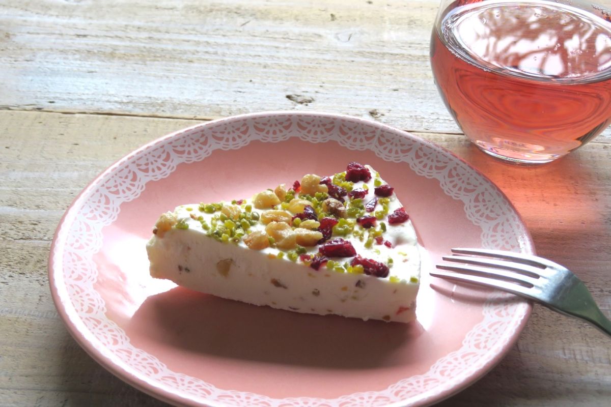 冷凍庫から出して、お皿にのせれば、おやつというよりはイタリアンレストランで味わうデザートのよう。さわやかな酸味のチーズクリームの上にのっているのは、細かく砕いたピスタチオやクルミ、ドライクランベリー、チェリーの砂糖漬け、レモンピール、ドライパパイヤなど。ナッツの香ばしさと、フルーツの甘酸っぱさがアクセントになっています。