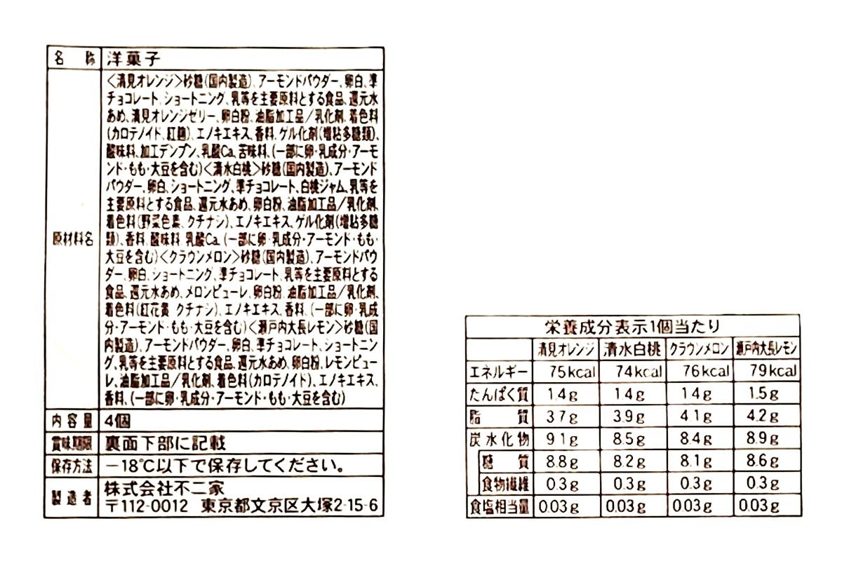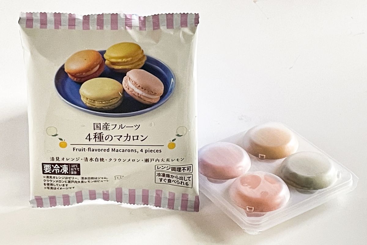 「国産フルーツ 4種のマカロン」451円は、清見オレンジ、清水白桃、クラウンメロン、瀬戸内大長レモンの4種のマカロンが1袋に入っています。