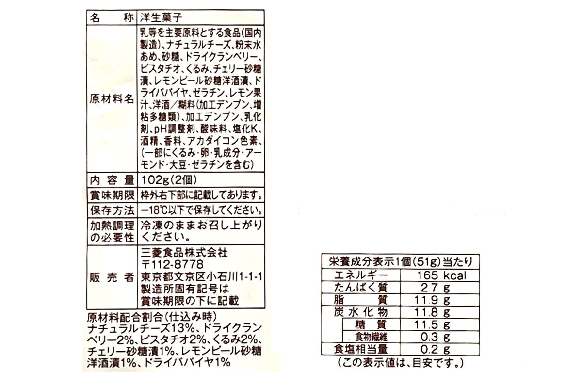 気になるカロリーは1個あたり165kcal。ナチュラルチーズの割合は13%です。