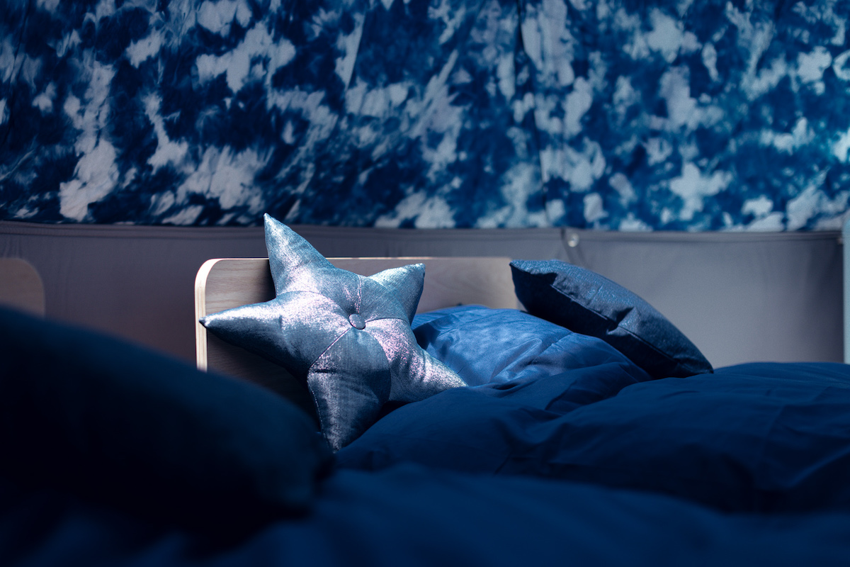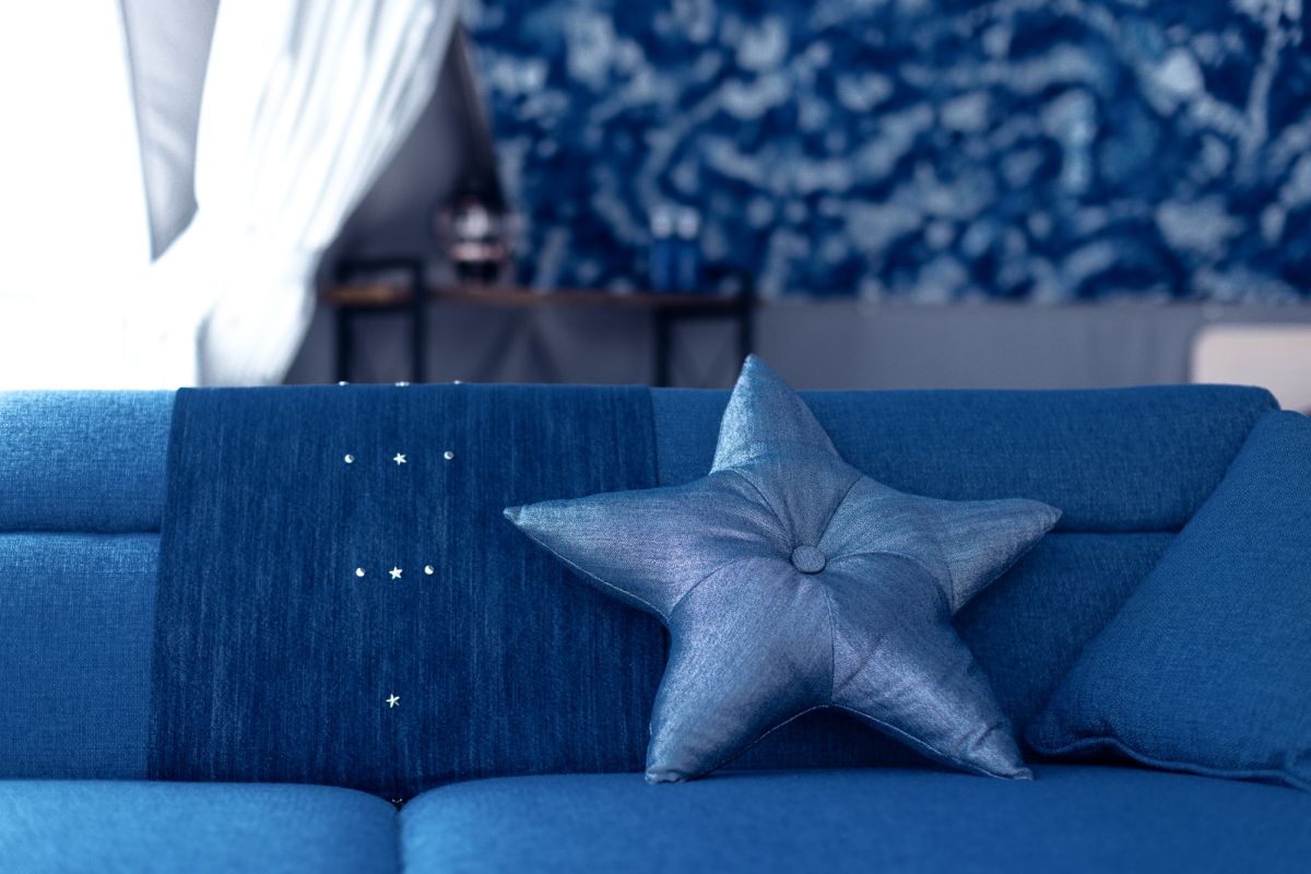 この部屋に華を添えるのが、デニムクッションやカバーなど魅力的なファブリックの数々。岡山が誇るクロキ社製の銀糸を使用したシルバーデニムを使用し、星型に型取られたクッションやカバーはインテリアのアクセントに。銀色に輝くシルバーデニムの艶めきも、室内を華やかに彩ってくれます。