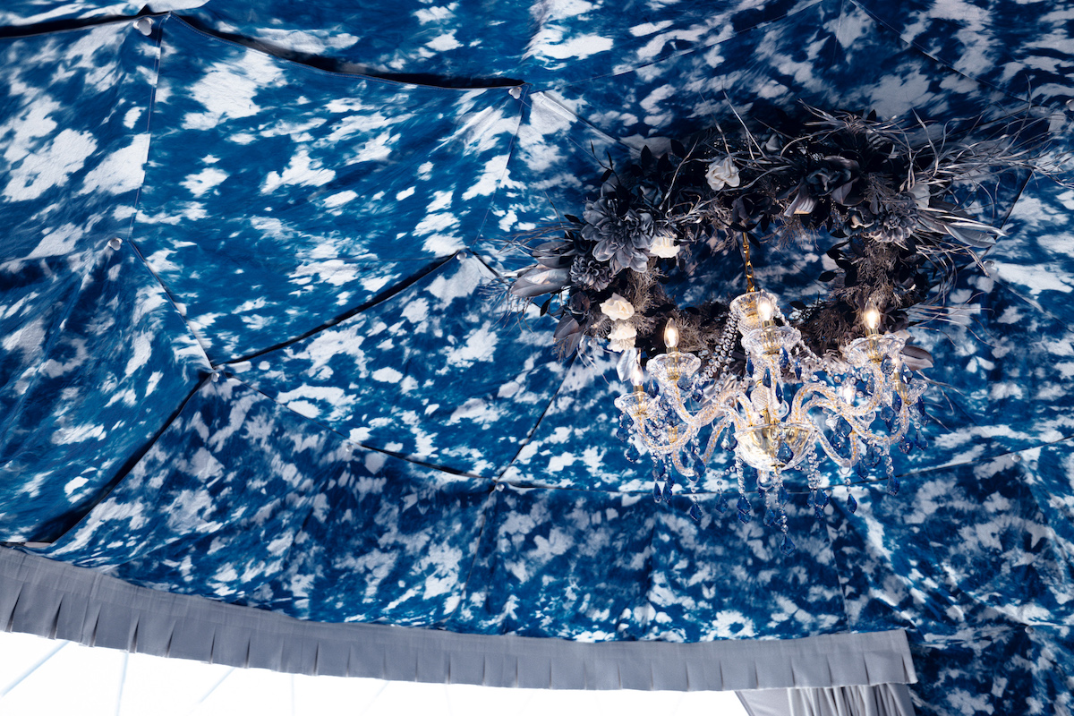 幻想的な室内を包み込む天井でひと際目を引くのが、装飾家の能勢聖紅氏がデザインしたアーチ。こちらは、昨年販売され大人気となった青木被服製のデニムローズを絡ませたデザインで、アーチと共に存在感を見せるシャンデリアが藍色の空間を照らしてくれます。