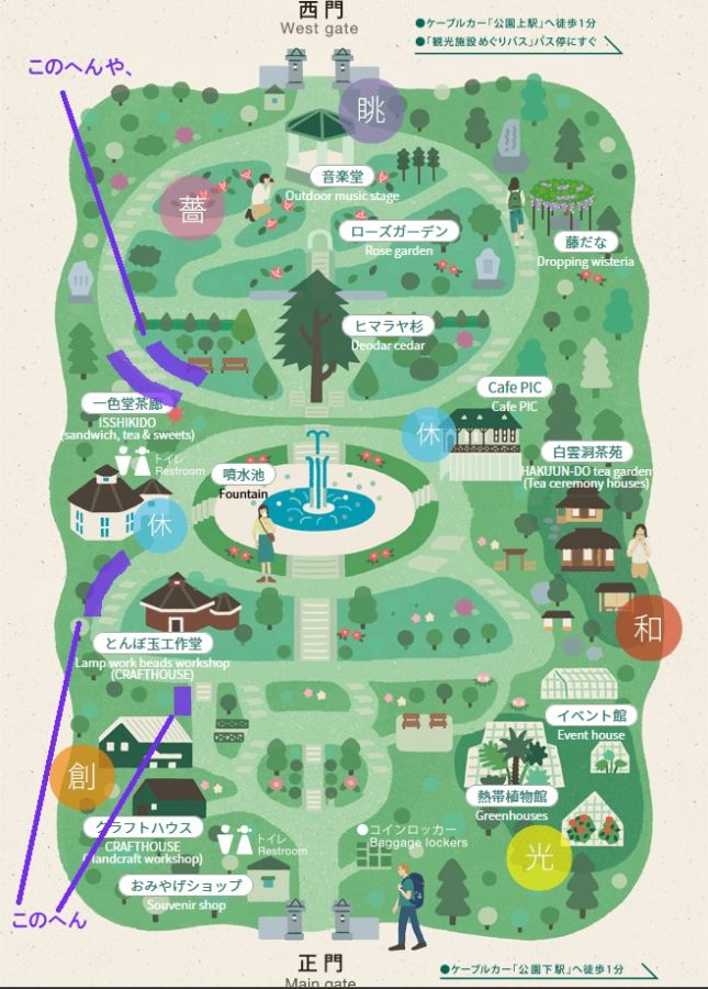 会場外でも園内を散策しながらさまざまなアジサイを見ることができます。箱根強羅公園のウェブサイトのマップをお借りしてポイントしましたので、ぜひご参考に!