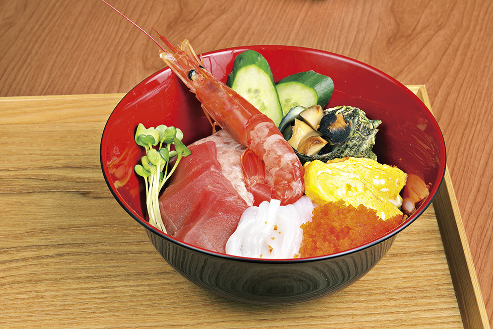 海産物の製造・販売で知られる渉水産の直営店。新鮮な海の幸を使った丼やラーメンのほか、スイーツも充実しています。写真は男鹿半島で水揚げされた海産物を味わえる「海鮮丼」1200円。目の前の鵜ノ崎海岸を見ながら食事を楽しみましょう。店内では「さかなの味噌」700円など加工品の販売も。