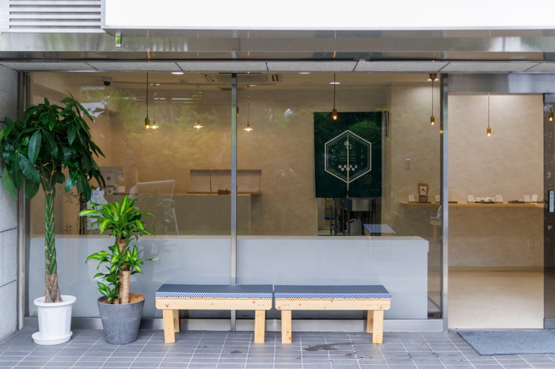 店内は、「え!ほんとに和菓子店!?」と驚いてしまうほどのシンプル&スタイリッシュな空間。ペンダントライトに観葉植物と、まるでカフェのような雰囲気。窓ぎわにはベンチがあり、ここでゆっくりと和菓子をいただけます。