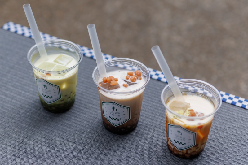 最高級の抹茶を取り扱う北川半兵衛商店の抹茶やほうじ茶、広島の老舗きな粉屋ウエマンの黒蜜きな粉豆乳をベースに、メーカーならではの独自技術でモチモチ食感の小粒サイズに加工された生八つ橋をたっぷりと。ニッキ(シナモン)がふわりと香りそれぞれの美味しさを引き立ててくれます。タピオカドリンクのようにカジュアルに味わえるのもうれしい一杯。しっかりかき混ぜてから飲みましょう♪