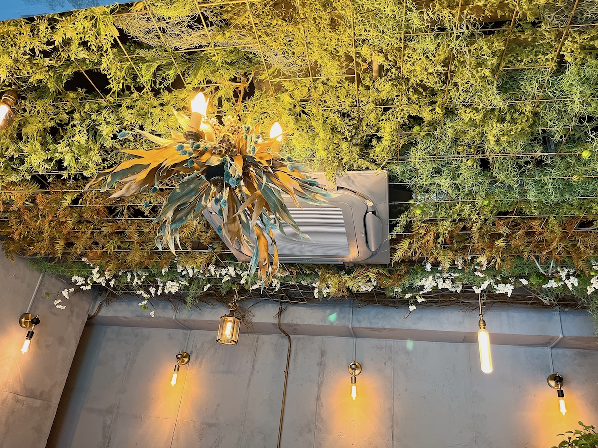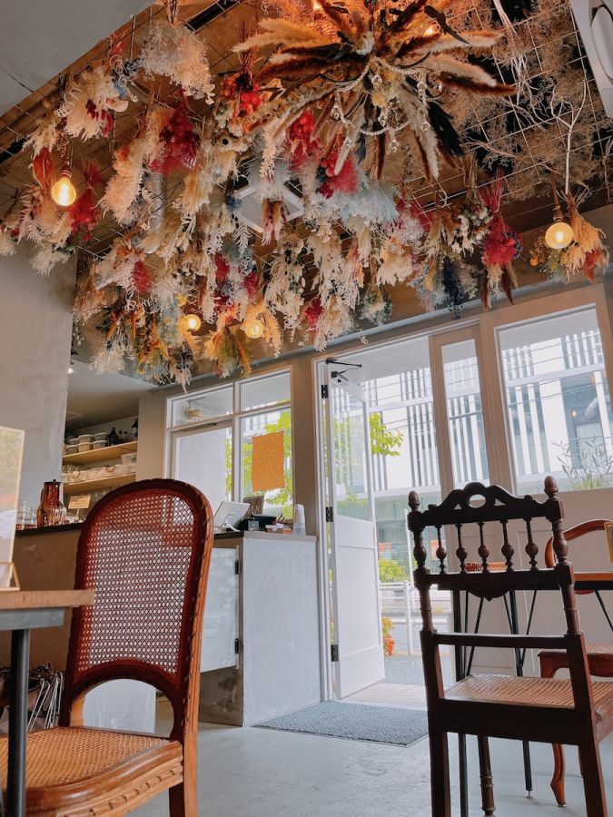 店内をひと通り見回したところで上を向いてみてください。天井がおしゃれな店内をさらに華やかにするドライフラワーで埋め尽くされているんです。