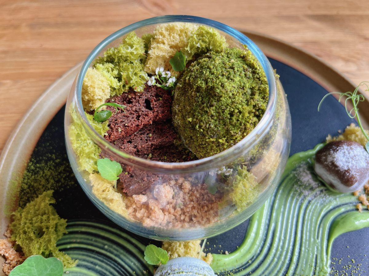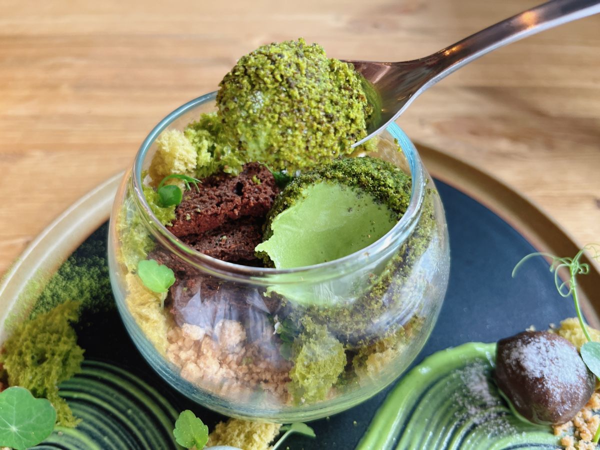 裏から見るとわかるように、苔のアイスの裏にはひんやりとしたフルーツがたっぷり詰まっているんです!ユズのソルベやマンゴー、洋酒につけたアンズなど、食べ進めていくとさわやかなフルーツが顔を出します。さらに底にはクランブルクッキーと黒ごまのパンナコッタ、抹茶ムースが隠れており、最後までどんな味と出合えるのかワクワクしながらさっぱりといただくことができました。